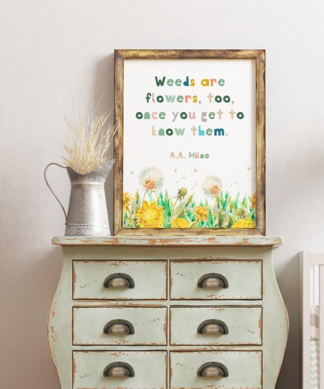 Weeds are flowers, too, once you get to know them. ― A.A. Milne Quote – Nursery Wall Art, Kindness Quotes, A.A. Milne Quote, Beauty Inside