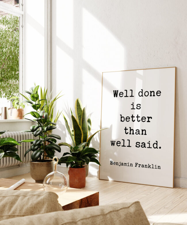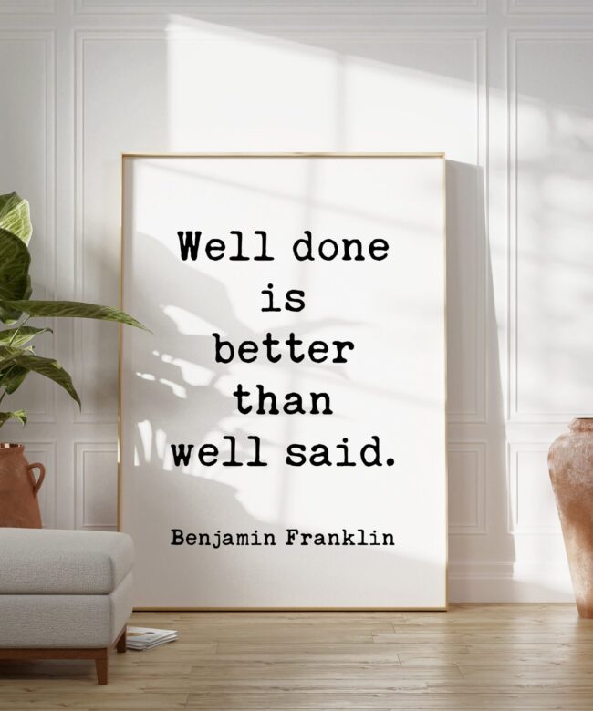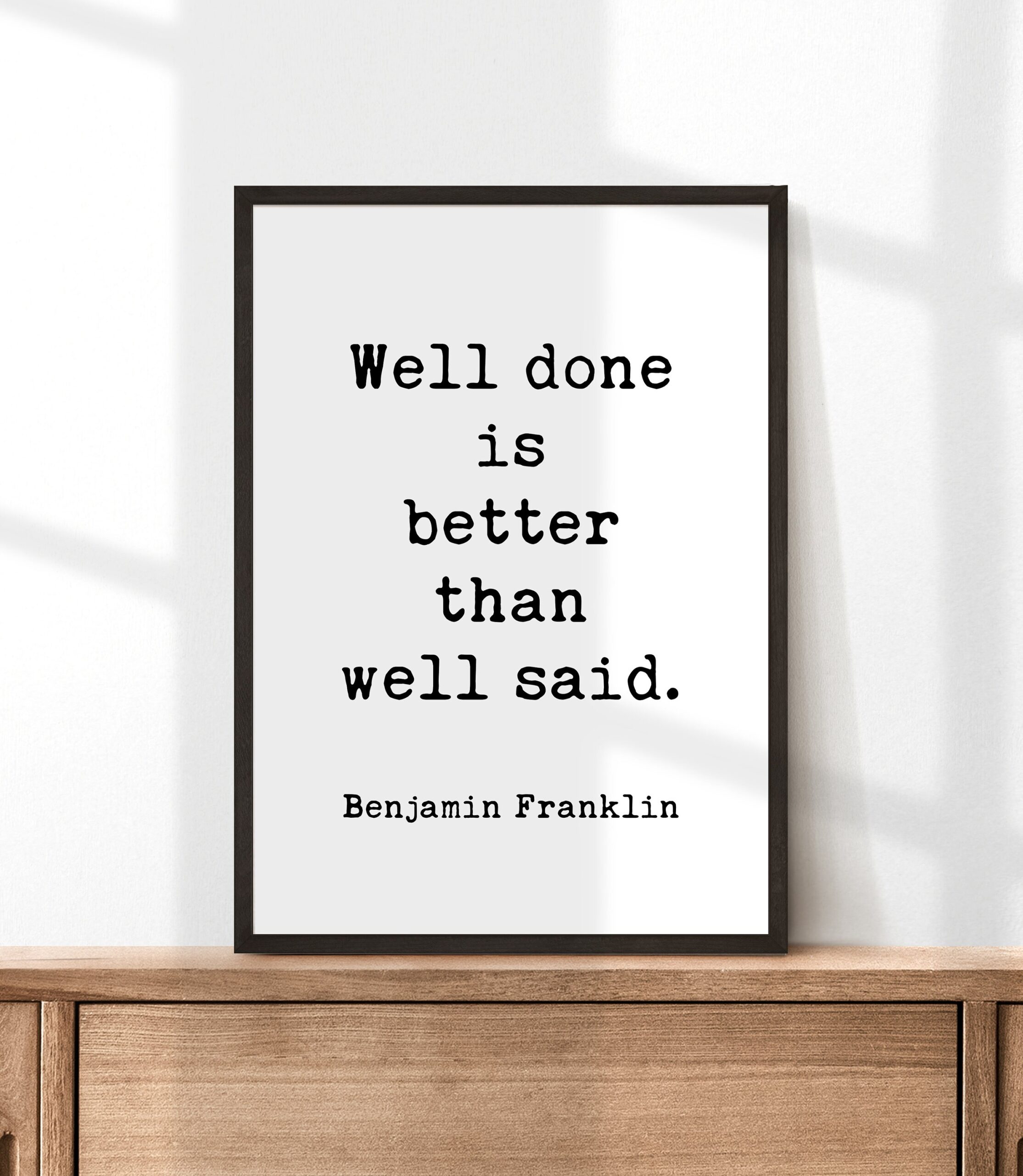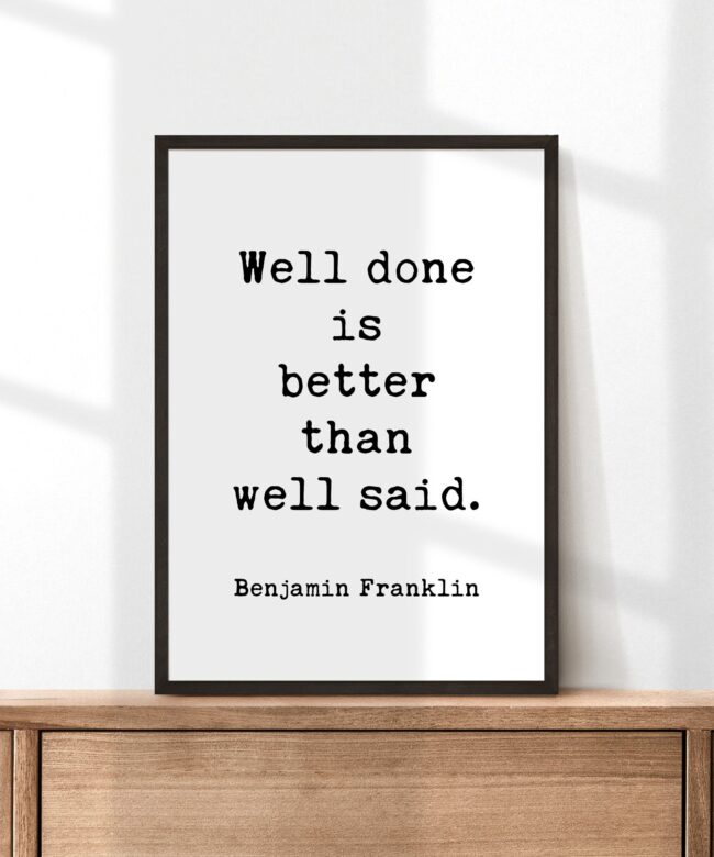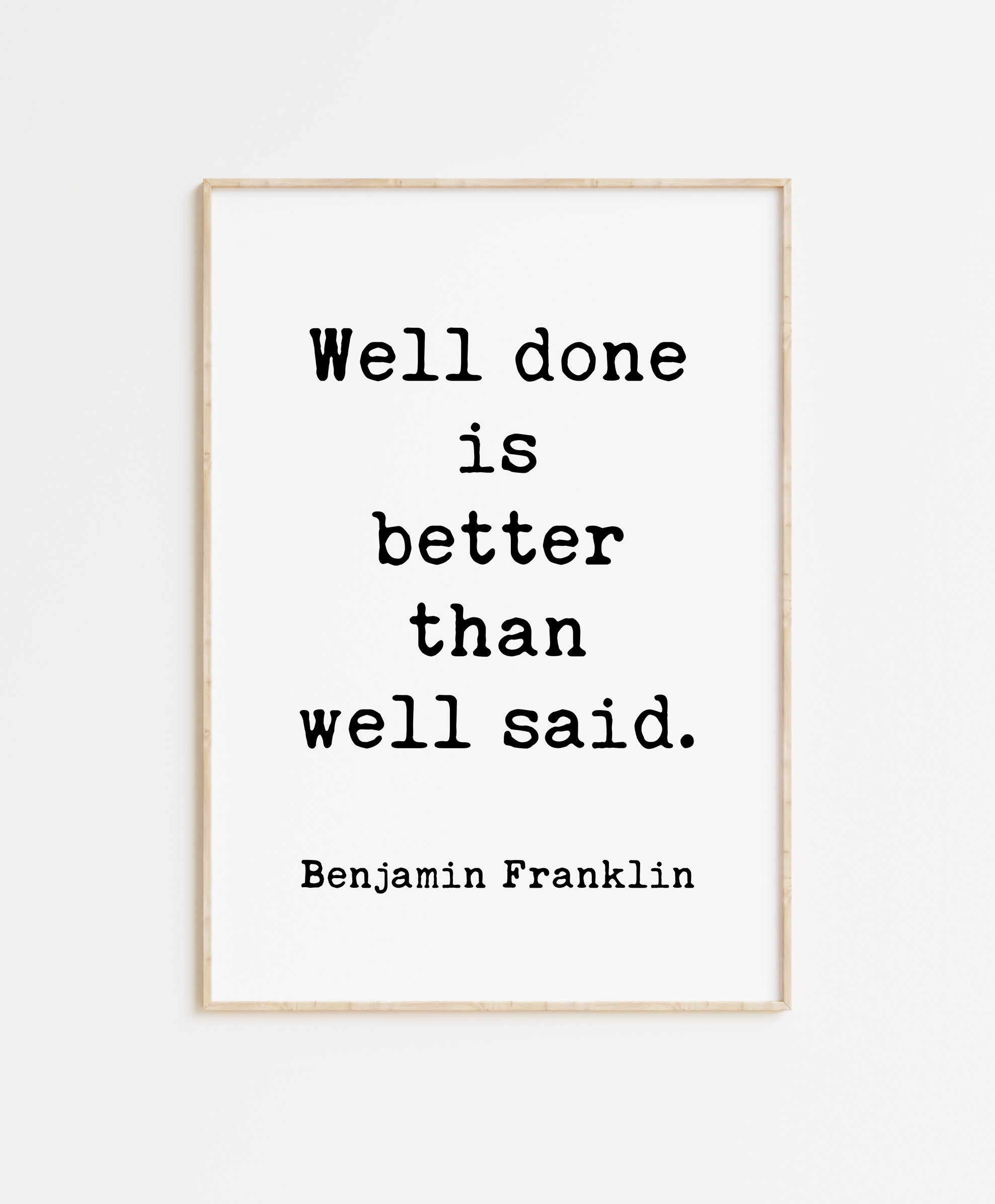 Introducing our “Well done is better than well said” Typography Art Print, inspired by the timeless wisdom of Benjamin Franklin. This captivating piece combines the power of words with the beauty of typography, creating a visual masterpiece that will ignite your motivation and inspire action.