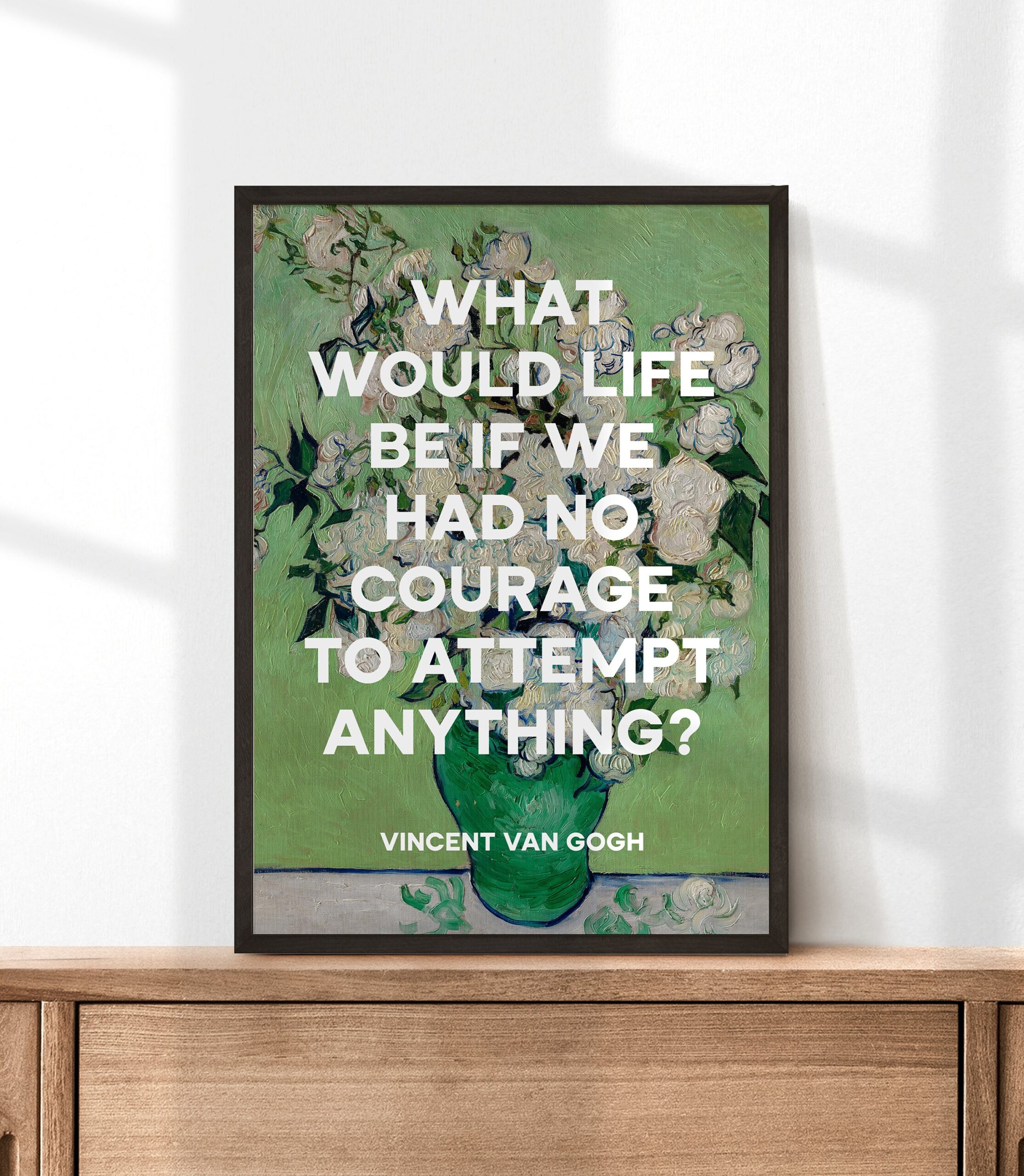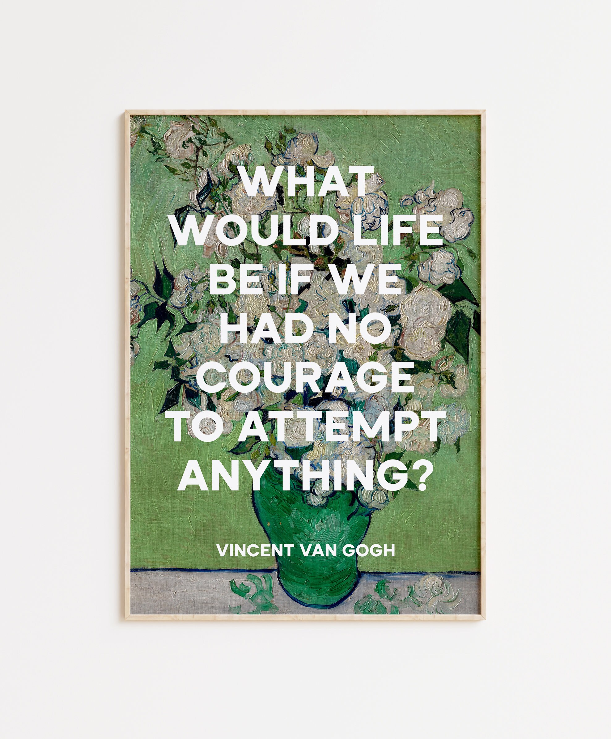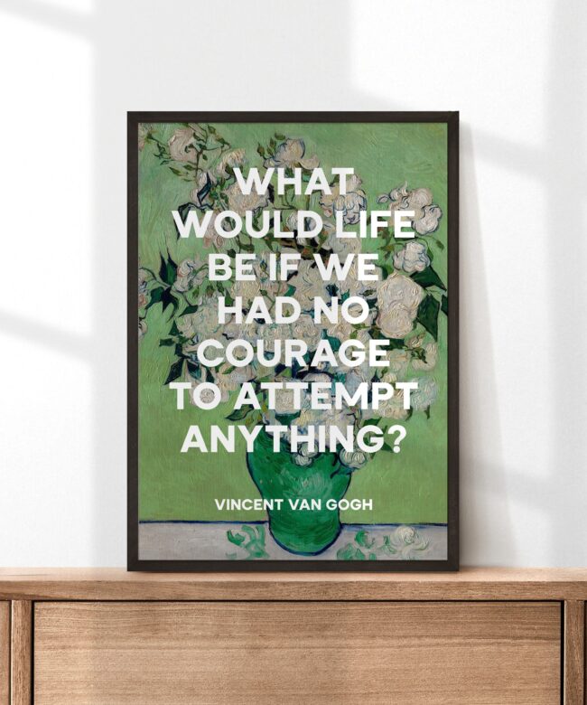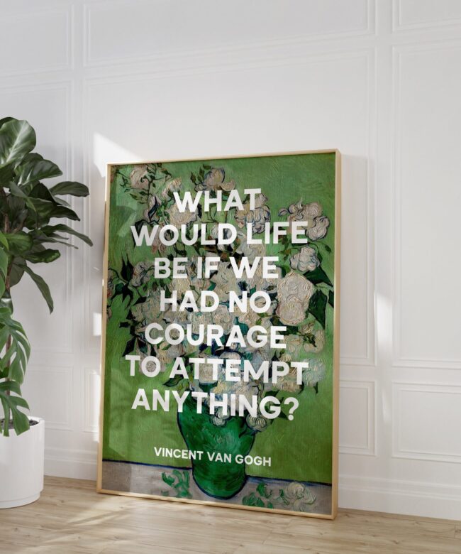 Fuel your courage and ignite your dreams with this captivating typography art print. Featuring the inspiring words of Vincent van Gogh, “What would life be if we had no courage to attempt anything?” nestled amidst a reproduction of his vibrant rose painting from 1890, this piece is a powerful reminder to embrace the unknown and chase your passions.