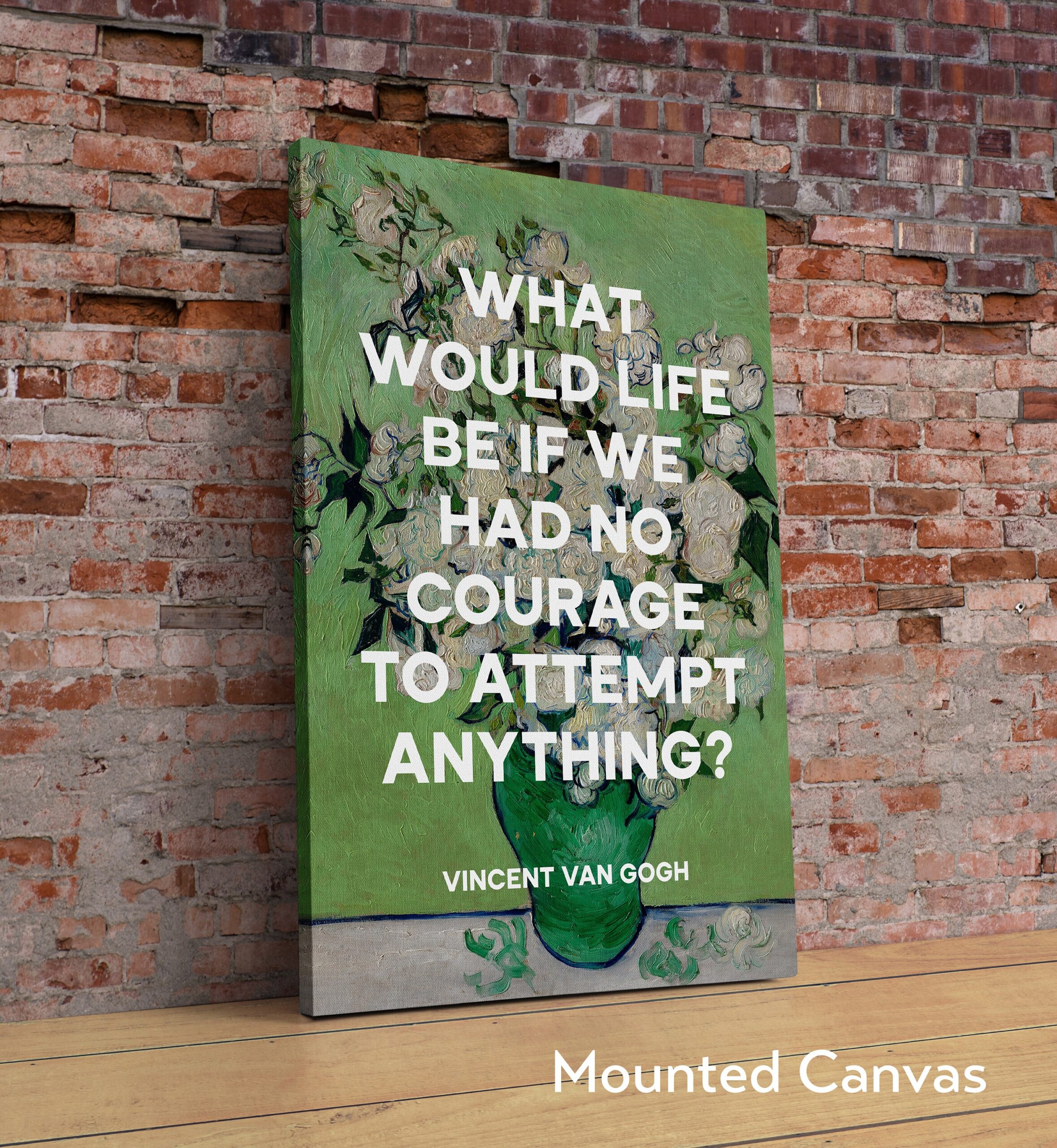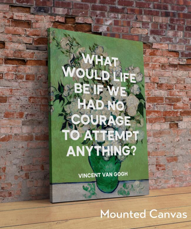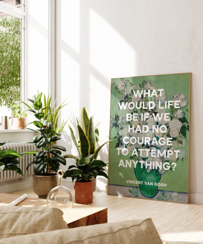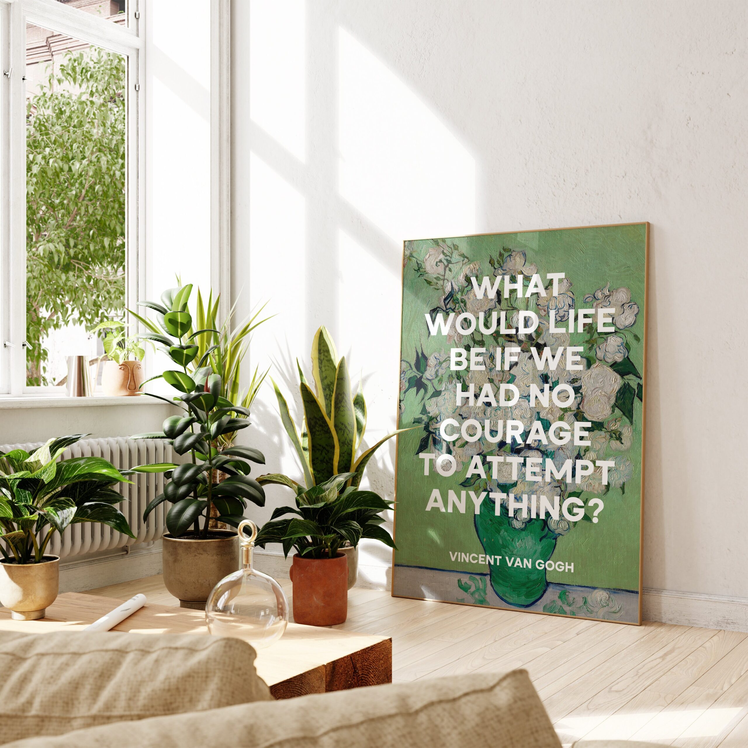 Fuel your courage and ignite your dreams with this captivating typography art print. Featuring the inspiring words of Vincent van Gogh, “What would life be if we had no courage to attempt anything?” nestled amidst a reproduction of his vibrant rose painting from 1890, this piece is a powerful reminder to embrace the unknown and chase your passions.