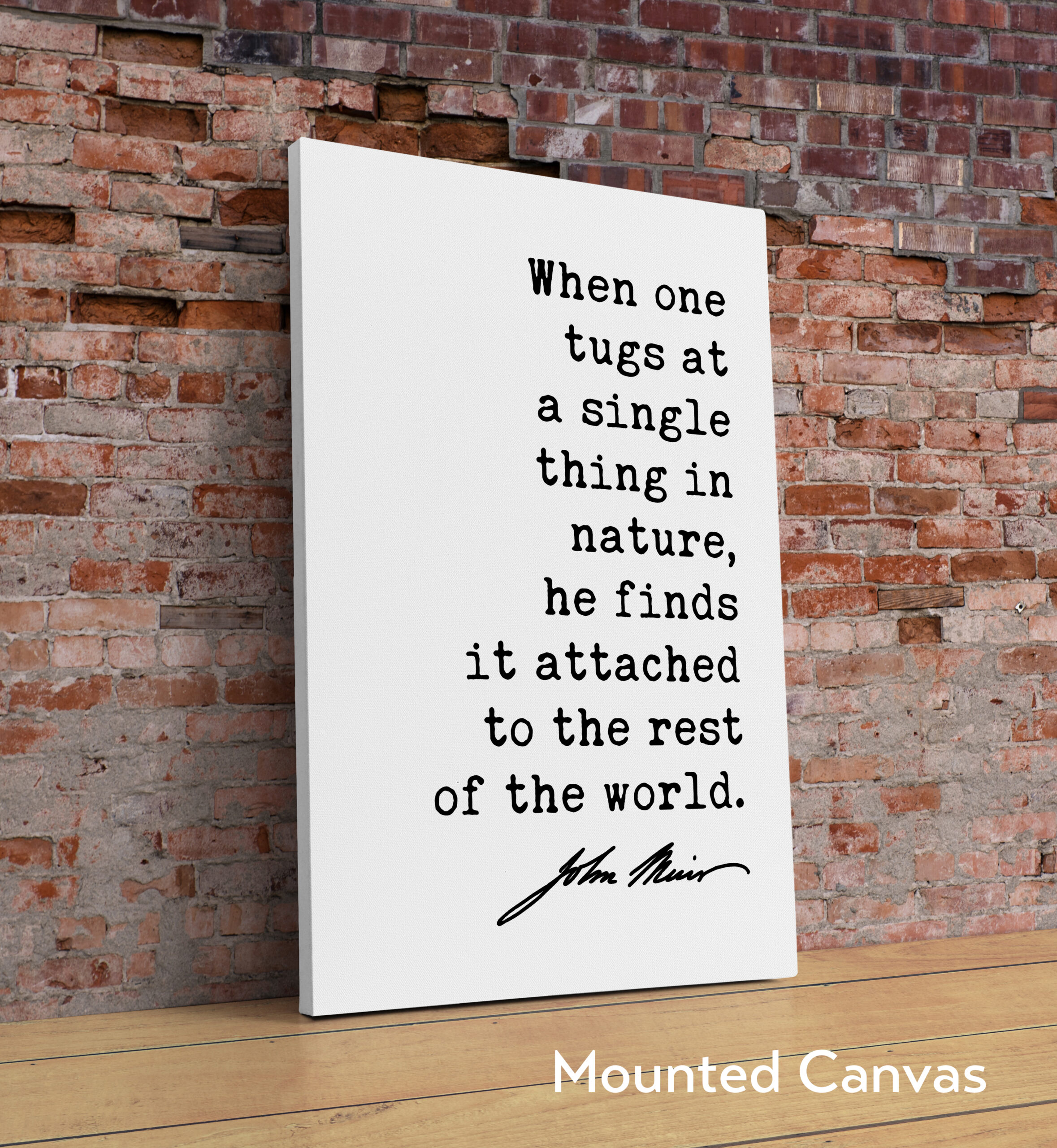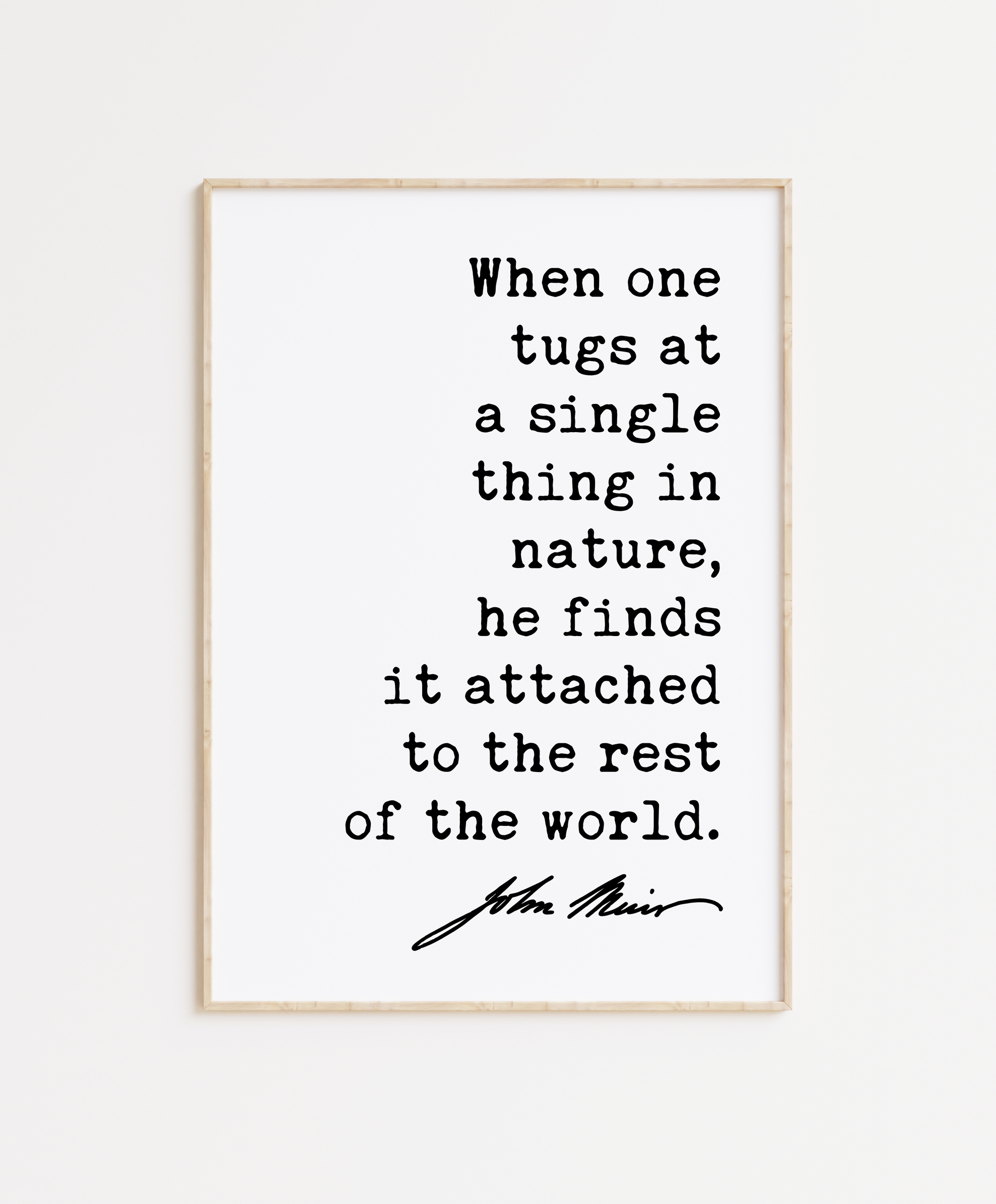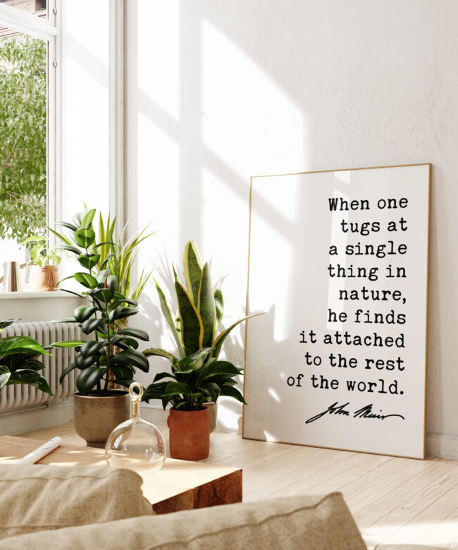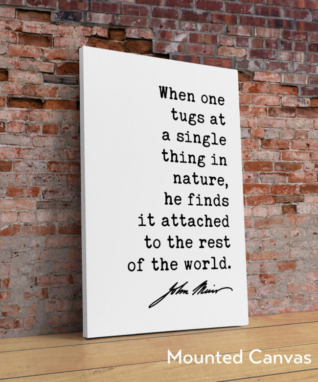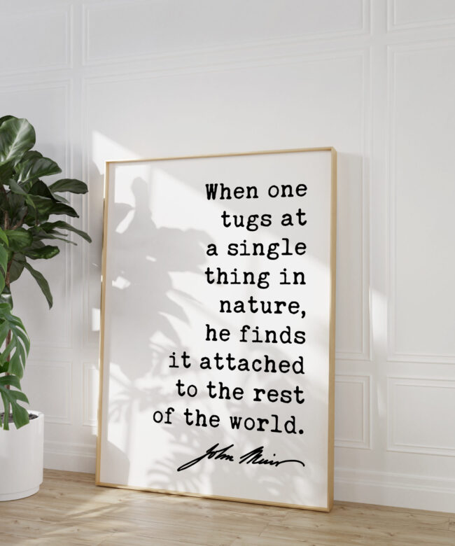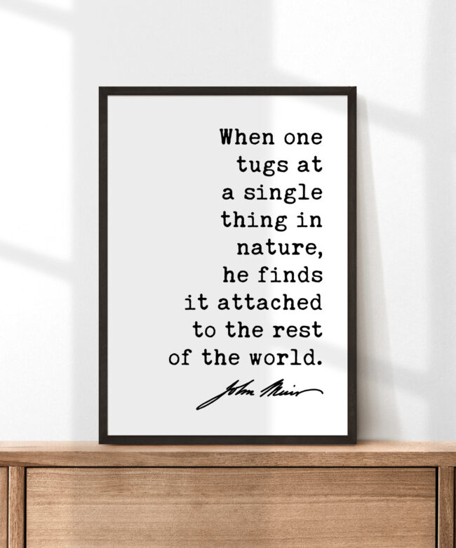 More than just words on a wall, this piece is a powerful reminder of the delicate balance and intricate web of life that exists in our natural world. The minimalist design allows the quote to shine, reflecting the simplicity and profound interconnectedness Muir observed in nature.