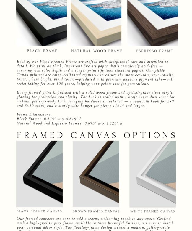 Mounted Canvas Prints are NOT framed. Our art canvas is wrapped around a high quality 1.25″ thick wood stretcher to create a gorgeous gallery wrap that’s ready for hanging. They are printed on Acid-free, PH-neutral, poly-cotton base. Printed on textured and fade-resistant canvas. Canvas is a great option because of its minimalist beauty without the expense of framing and matting.