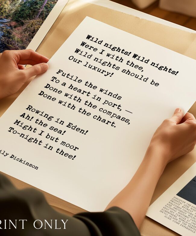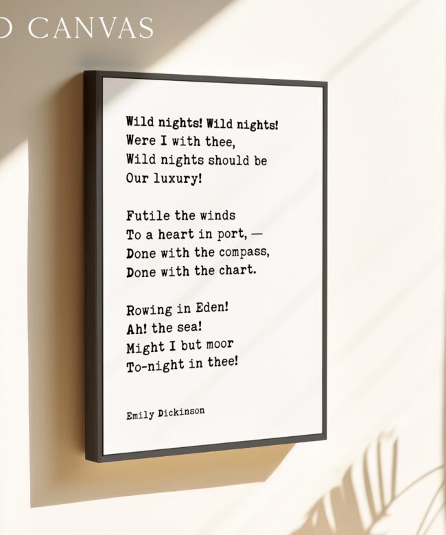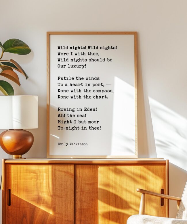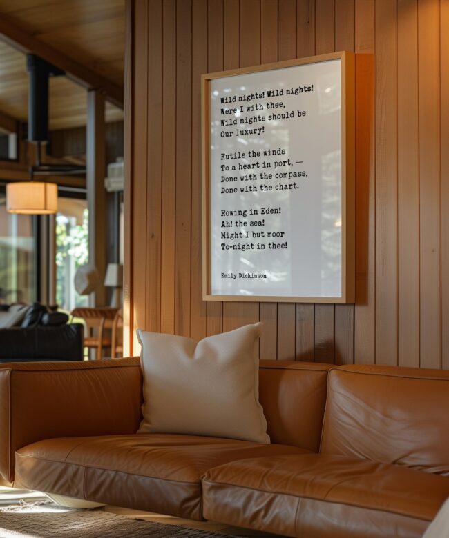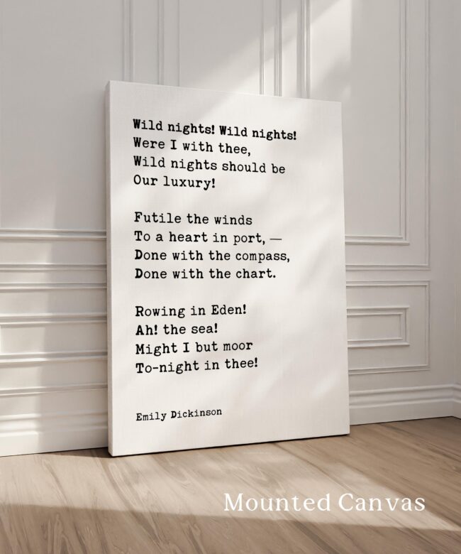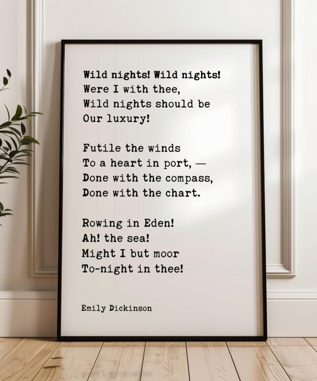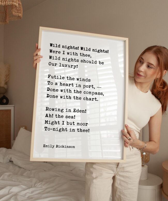 This striking typography art print features “Wild Nights! Wild Nights!” by Emily Dickinson, one of her most passionate and evocative poems. Set in bold, timeless type, the poem captures longing, devotion, and the quiet thrill of emotional arrival. Perfect for bedrooms, intimate living spaces, or anywhere romance and poetry belong.