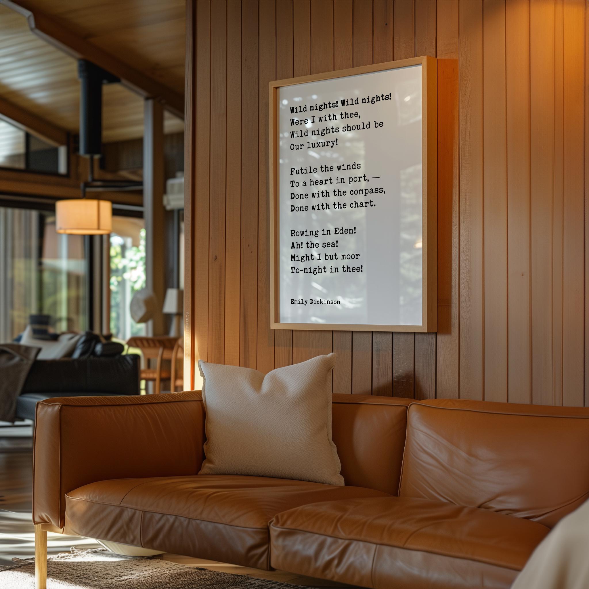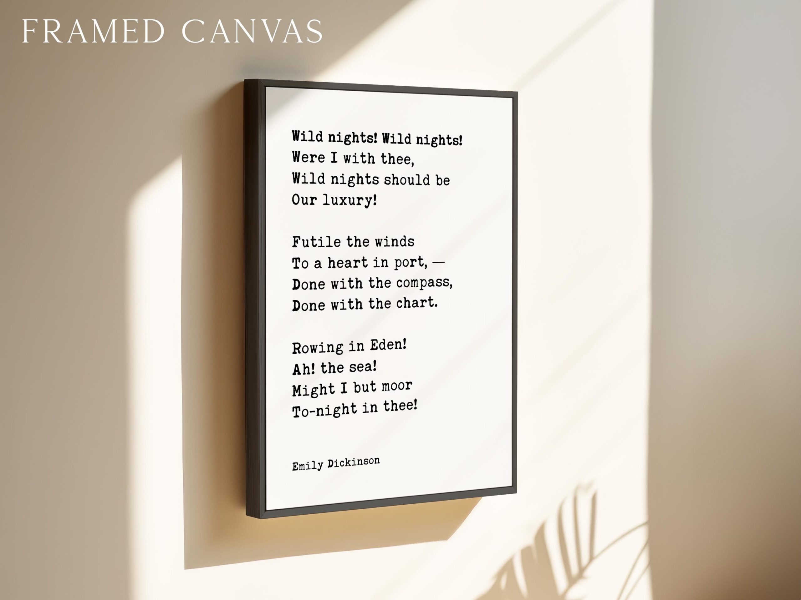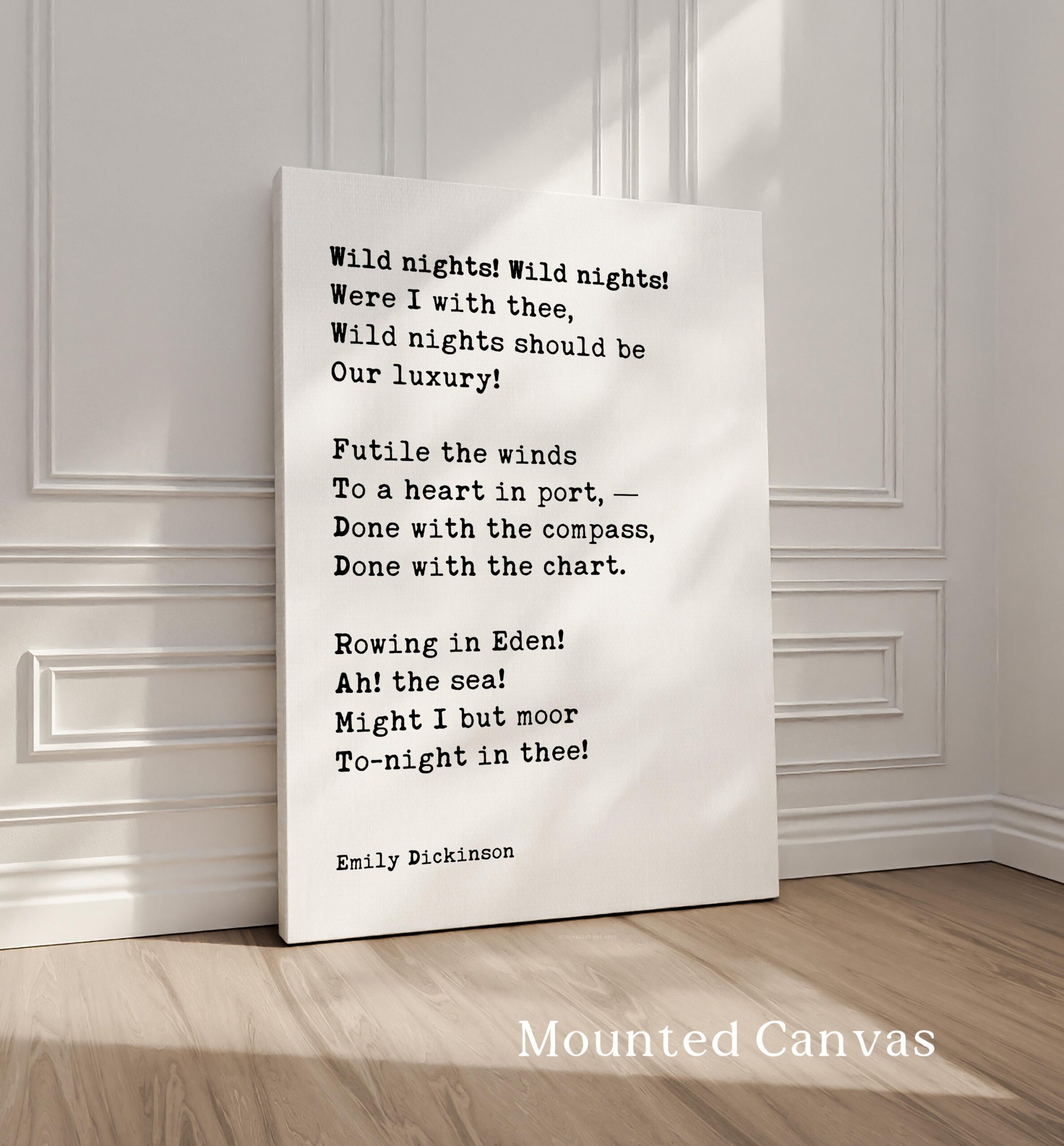This striking typography art print features “Wild Nights! Wild Nights!” by Emily Dickinson, one of her most passionate and evocative poems. Set in bold, timeless type, the poem captures longing, devotion, and the quiet thrill of emotional arrival. Perfect for bedrooms, intimate living spaces, or anywhere romance and poetry belong.