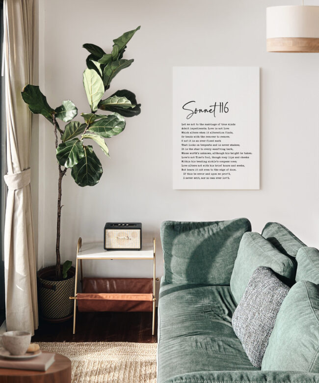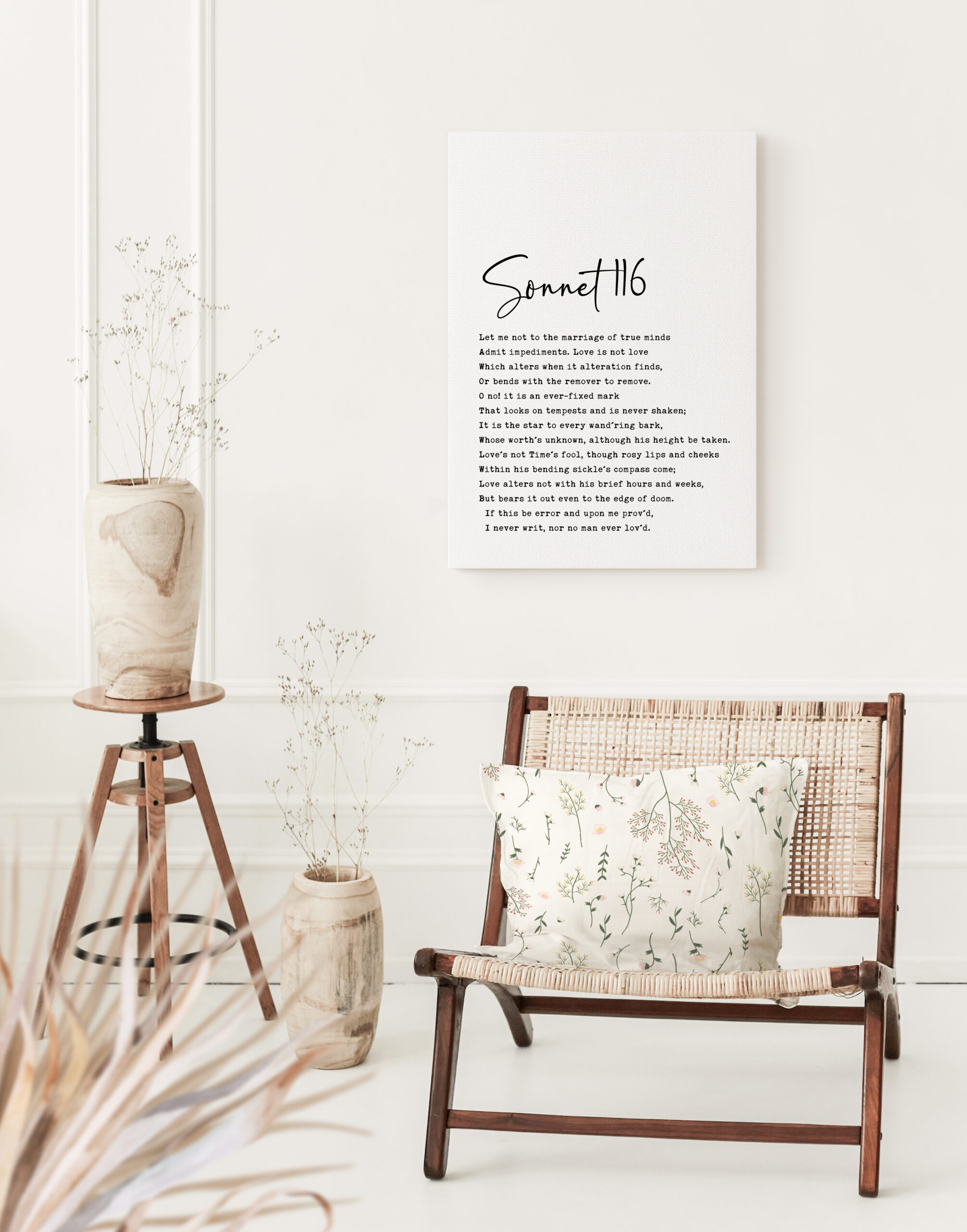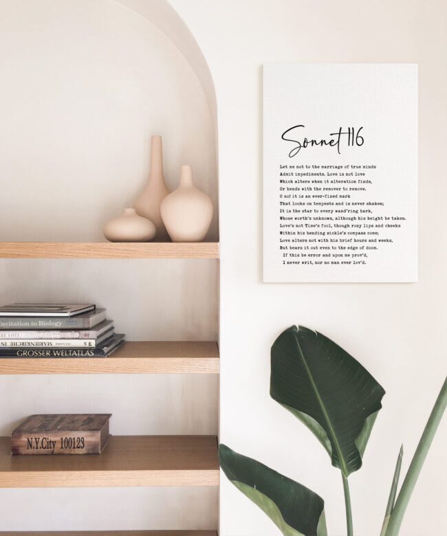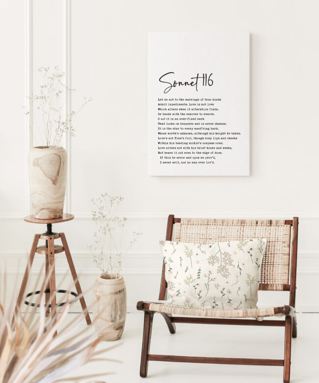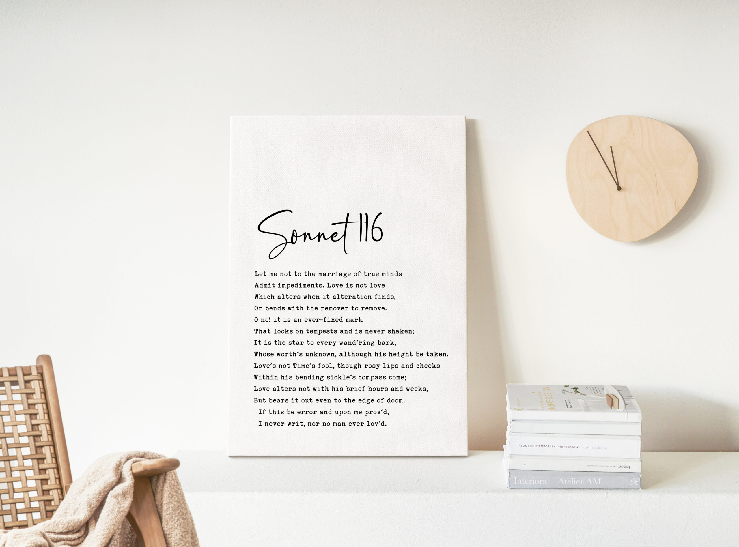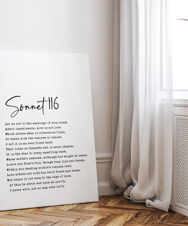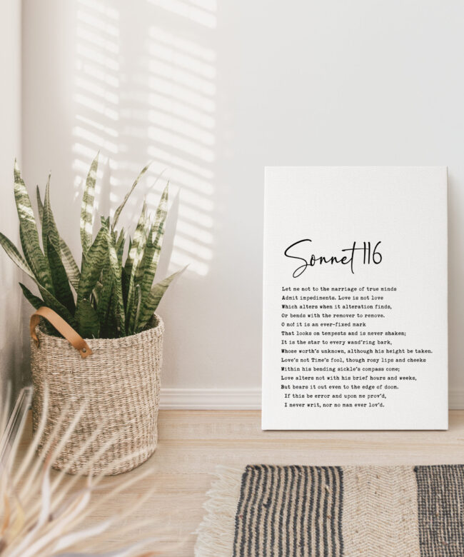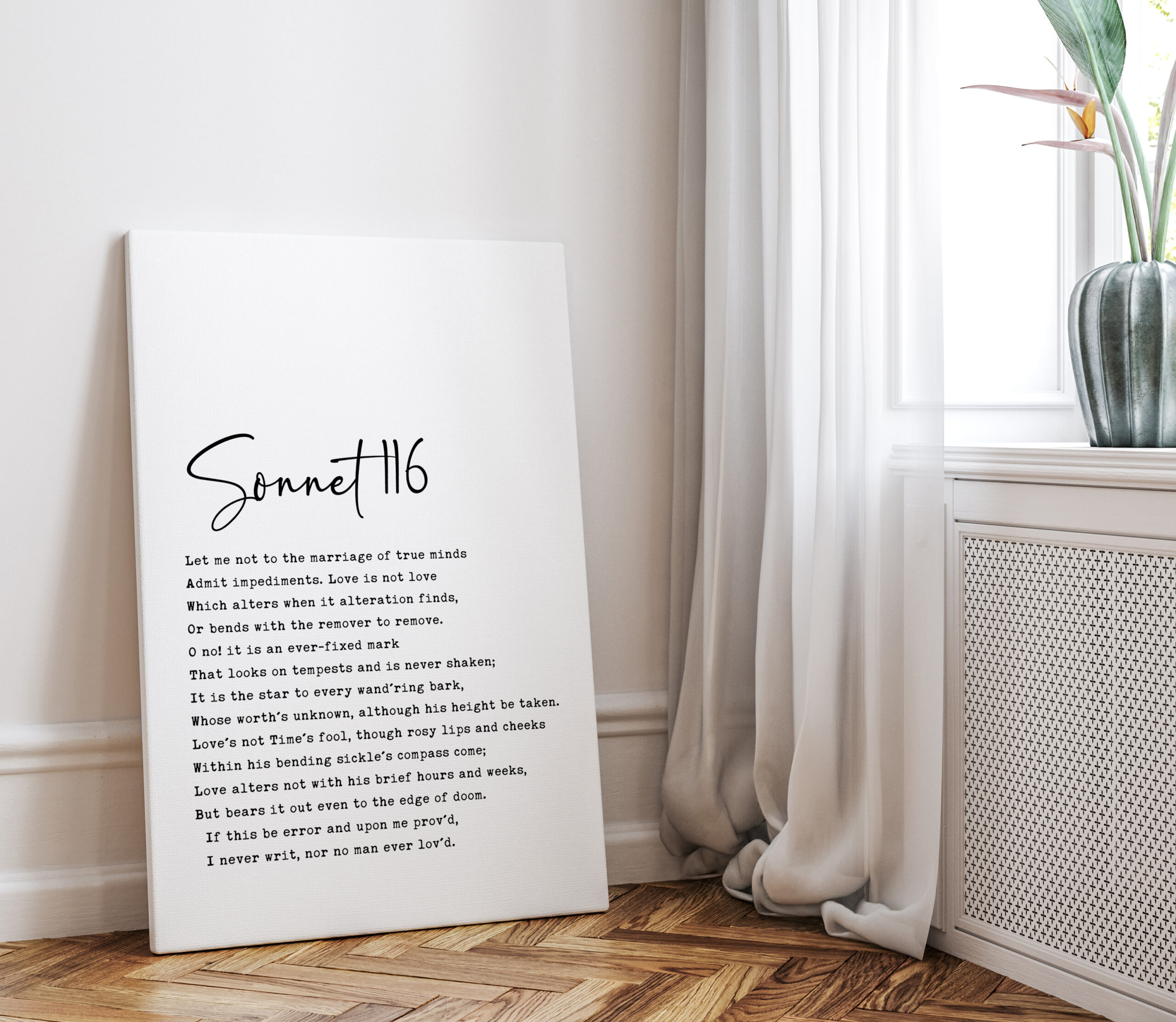 Celebrate the timeless beauty of love with this captivating canvas typography art print featuring the entirety of William Shakespeare’s iconic Sonnet 116: