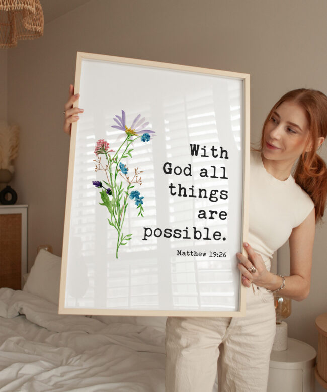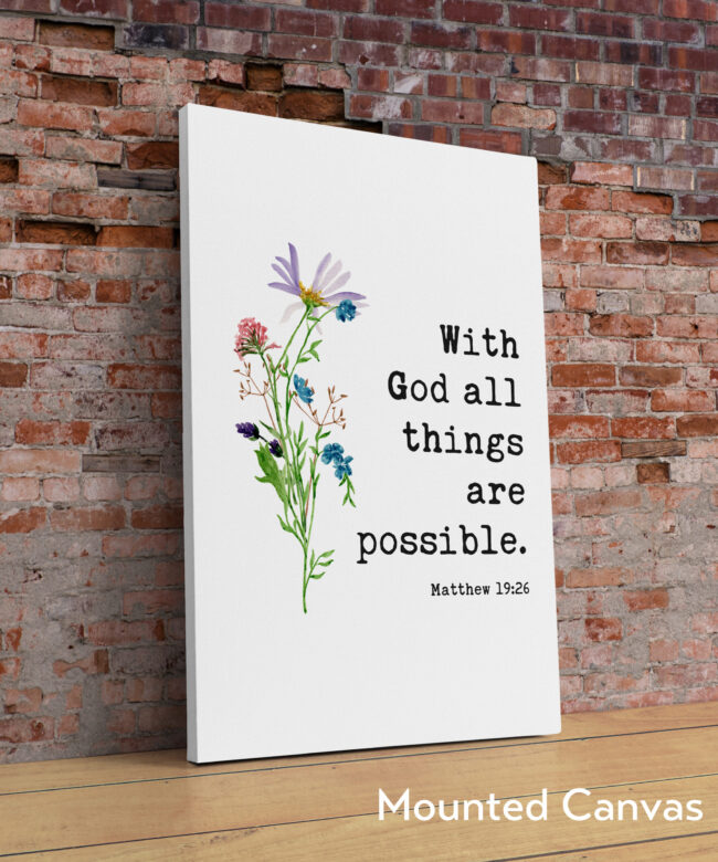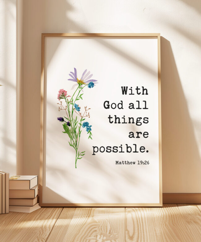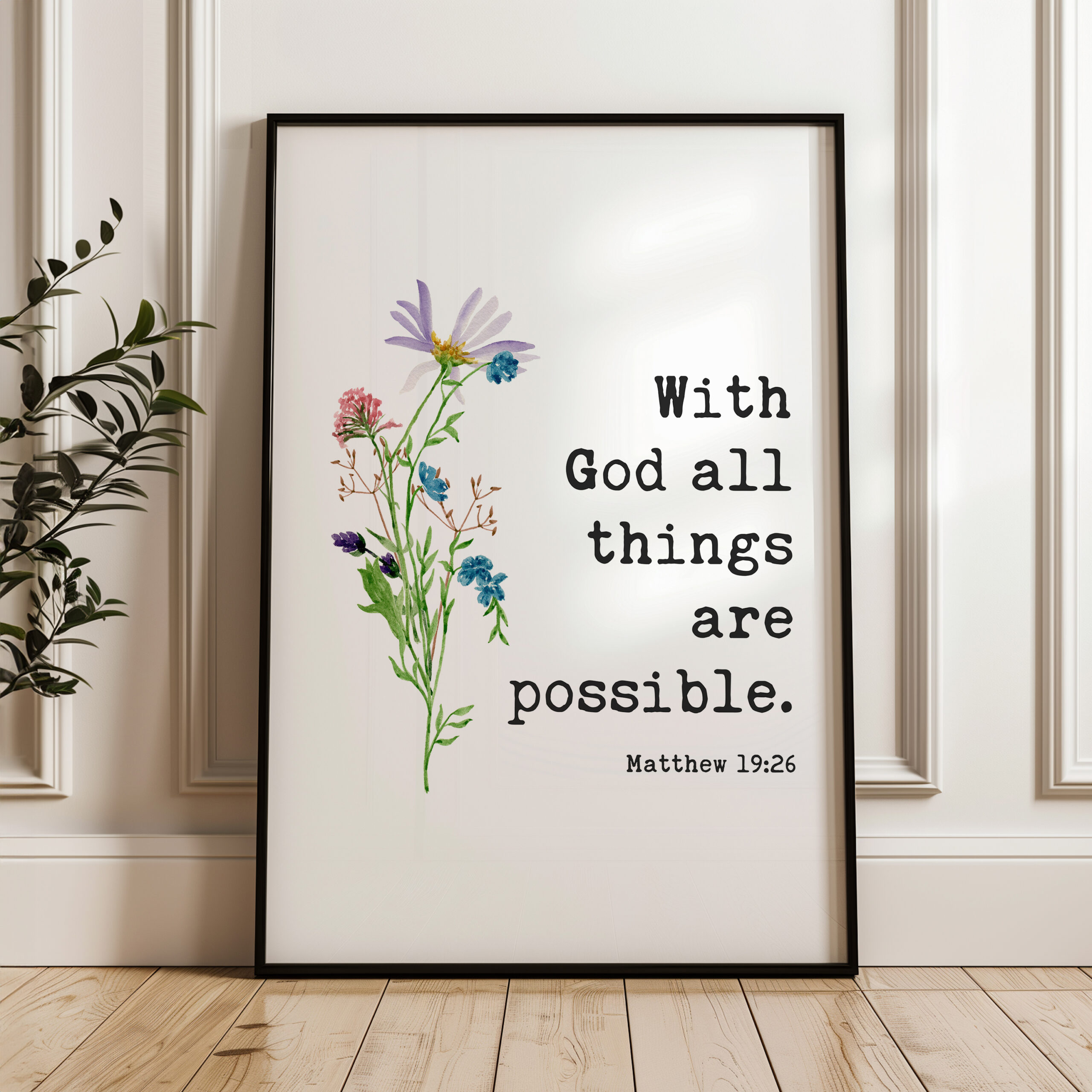 With God all things are possible. Matthew 19:26 Bible Verse with Wildflowers Typography Art Print