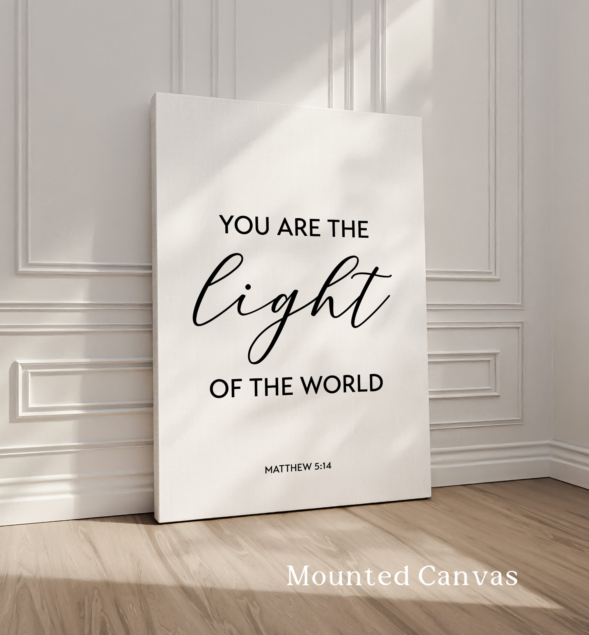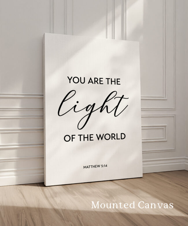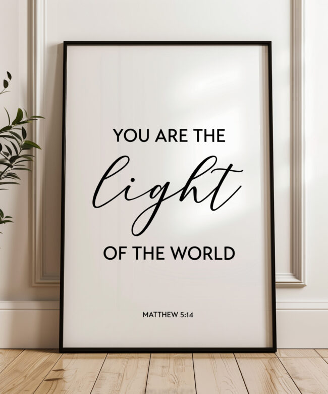 Illuminate your space with this inspiring typography art print featuring the powerful scripture from Matthew 5:14: “You Are The Light of the World.” This print beautifully presents this uplifting message in a stylish font, serving as a daily reminder of inner potential and the importance of shining one’s light. Its simple yet impactful design makes it a meaningful addition to any home. This art print makes a great gift for baptisms, housewarmings, or as an encouraging present for anyone seeking inspiration and a reminder of their positive influence.