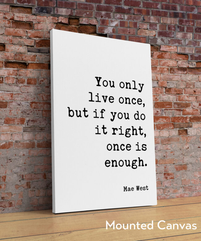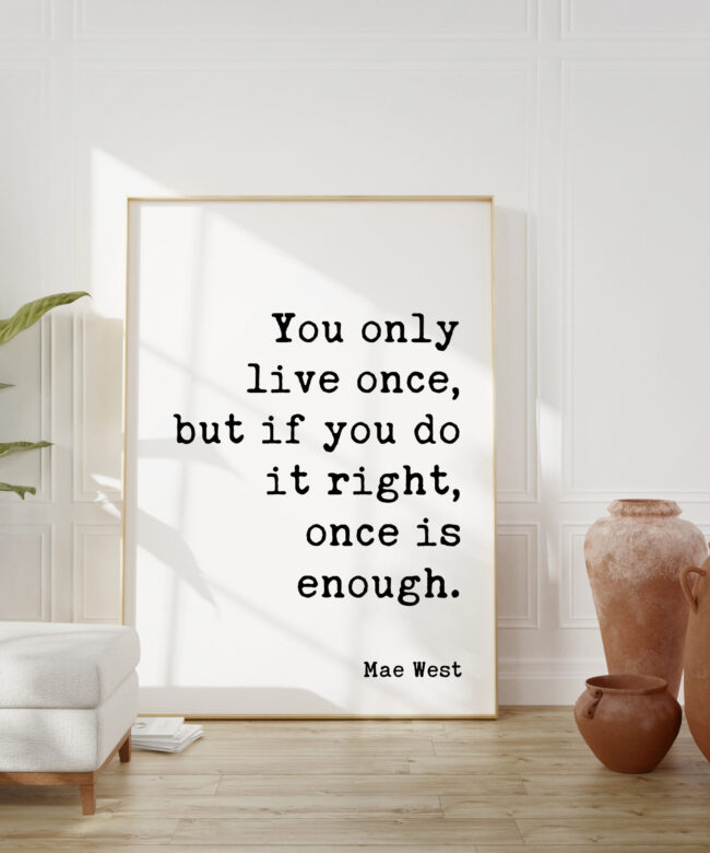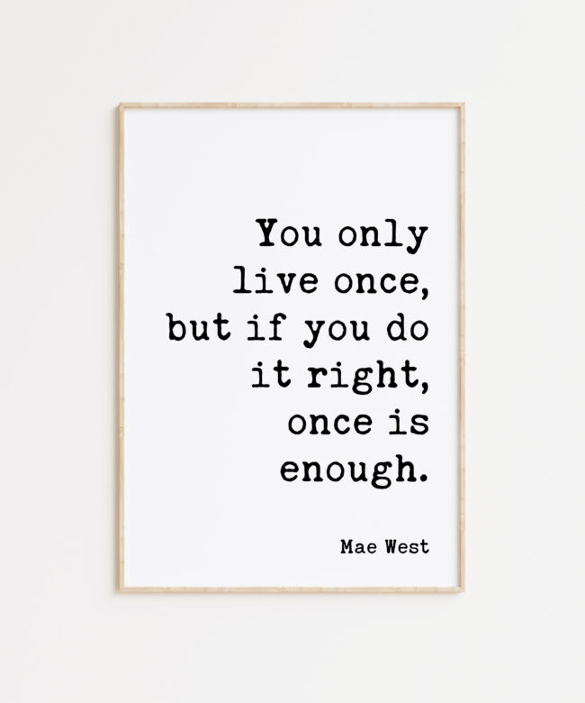 Embrace the power of living life to the fullest with this captivating typography art print, a celebration of Mae West’s iconic quote.