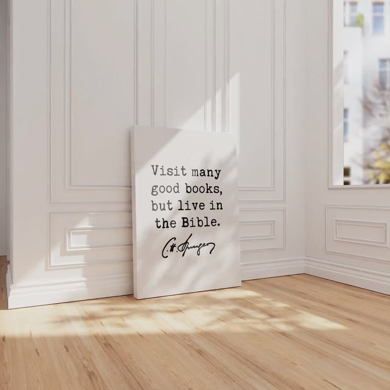Inspire faith and reflection with this beautifully simple typography art. C.H. Spurgeon’s words, “Visit many good books, but live in the Bible,” encourage a life focused on spiritual growth and grounding. This elegant print, available in mounted and framed canvas options, will make a meaningful addition to any home, study, or library, bringing both wisdom and a minimalist design into your space.
